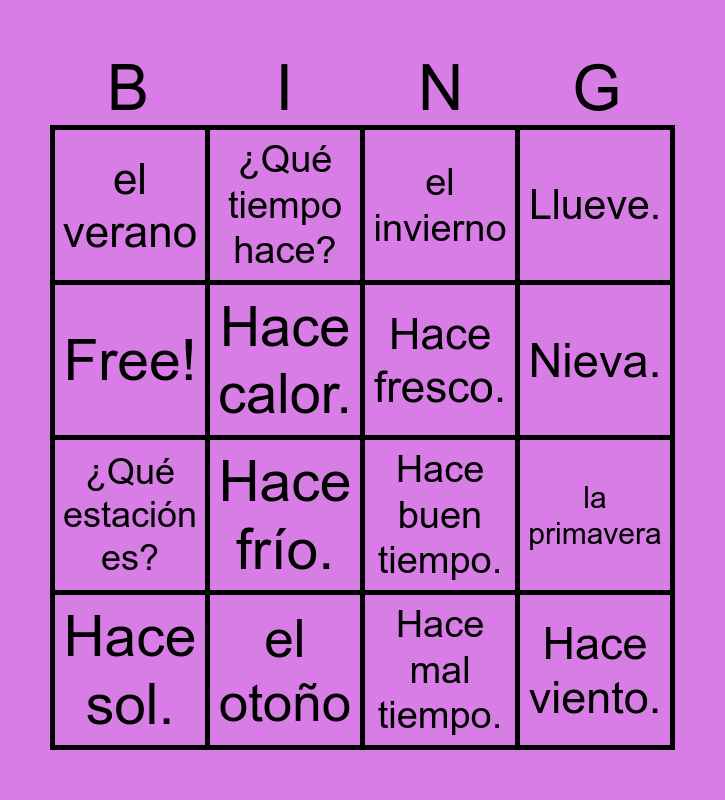 This bingo card has 16 words: el otoño, la primavera, el invierno, el verano, ¿Qué estación es?, ¿Qué tiempo hace?, Hace buen tiempo., Hace mal tiempo., Free!, Hace calor., Hace sol., Llueve., Hace frío., Nieva., Hace fresco. and Hace viento..