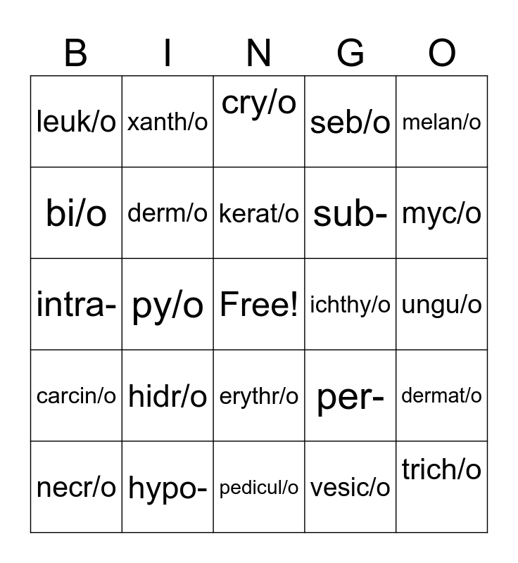 This bingo card has a free space and 37 words: aden/o, adip/o, cutane/o, derm/o, dermat/o, hidr/o, kerat/o, lip/o, melan/o, onych/o, py/o, seb/o, trich/o , ungu/o, bi/o, carcin/o, chem/o, cry/o , erythr/o, ichthy/o, leuk/o, myc/o, necr/o, pedicul/o, scler/o, vesic/o, xanth/o, xer/o , an-, epi-, hyper-, hypo-, intra-, pachy-, per-, sub- and trans-.