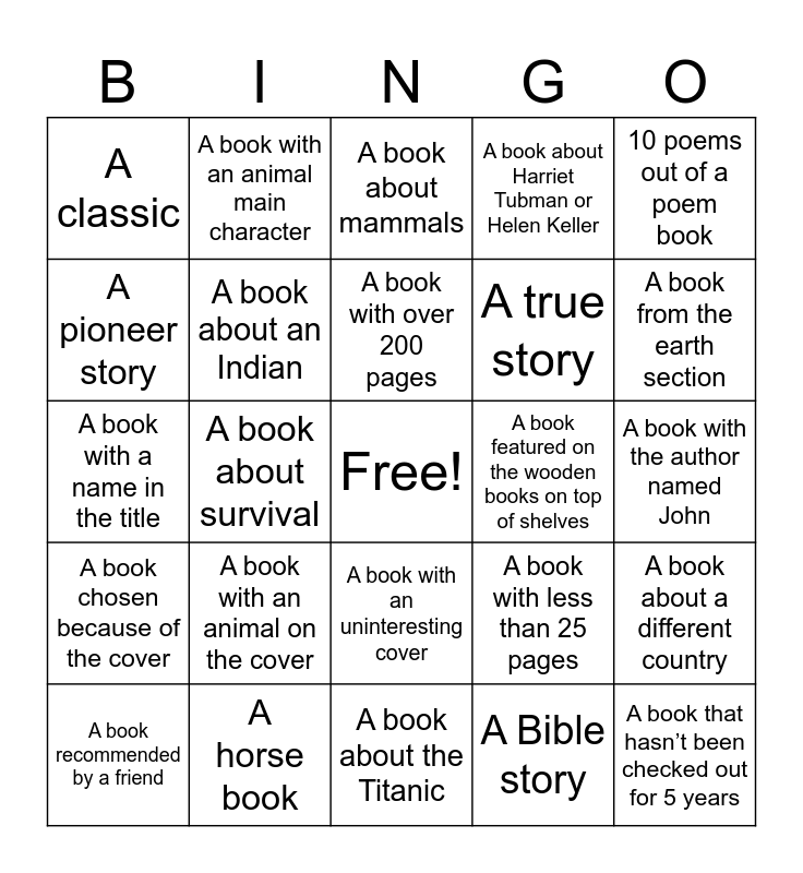 This bingo card has a free space and 24 words: A book with an animal on the cover, A horse book, A book with over 200 pages, A book recommended by a friend, 10 poems out of a poem book, A classic, A pioneer story, A book with an animal main character, A book featured on the wooden books on top of shelves, A book with an uninteresting cover, A true story, A book with a name in the title, A book with less than 25 pages, A book about a different country, A book about an Indian, A Bible story, A book with the author named John, A book about mammals, A book from the earth section, A book about survival, A book that hasn’t been checked out for 5 years, A book chosen because of the cover, A book about Harriet Tubman or Helen Keller and A book about the Titanic.