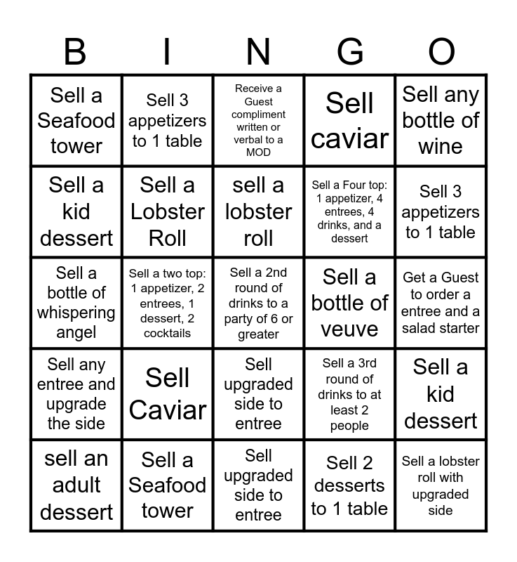 This bingo card has 25 words: Sell Caviar, Sell upgraded side to entree, sell a lobster roll, sell an adult dessert, Sell any bottle of wine, Sell a Seafood tower, Sell a kid dessert, Sell 3 appetizers to 1 table, Sell a bottle of veuve, Sell upgraded side to entree, Sell a Four top: 1 appetizer, 4 entrees, 4 drinks, and a dessert, Sell a bottle of whispering angel, Sell a 3rd round of drinks to at least 2 people, Sell a kid dessert, Sell a Lobster Roll, Sell a lobster roll with upgraded side, Get a Guest to order a entree and a salad starter, Receive a Guest compliment written or verbal to a MOD, Sell 3 appetizers to 1 table, Sell a two top: 1 appetizer, 2 entrees, 1 dessert, 2 cocktails, Sell a 2nd round of drinks to a party of 6 or greater, Sell a Seafood tower, Sell any entree and upgrade the side, Sell caviar and Sell 2 desserts to 1 table.