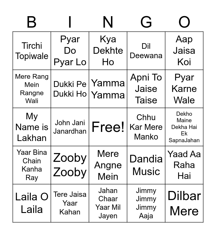 This bingo card has a free space and 34 words: Tamma Tamma Loge, Jimmy Jimmy Jimmy Aaja, Ek Do Teen Char, Om Shanti Om, Yaar Bina Chain Kanha Ray, Dukki Pe Dukki Ho, Aap Jaisa Koi, Laila O Laila, Pyar Do Pyar Lo, Har Kisiko Nahin Milta Yahan Pyar, Yamma Yamma, Kya Dekhte Ho, Janu Meri Jaan, Kitne Bhi Tu Karle Sitam, Chhu Kar Mere Manko, Pyar Karne Wale, Tere Jaisa Yaar Kahan, My Name is Lakhan, Zooby Zooby, Dandia Music, Mere Angne Mein, Teri Yaad Aa Rahi Hai, Tirchi Topiwale, Dekho Maine Dekha Hai Ek SapnaJahan, Jahan Chaar Yaar Mil Jayen, Dilbar Mere, Dil Deewana, Are Jane Kaise Kab Kahan Iqrar, Apni To Jaise Taise, Mere Rang Mein Rangne Wali, Har Kisiko Nahin Milta Yahan Pyar, John Jani Janardhan, Yaad Aa Raha Hai and Main Solah Baras Ki.