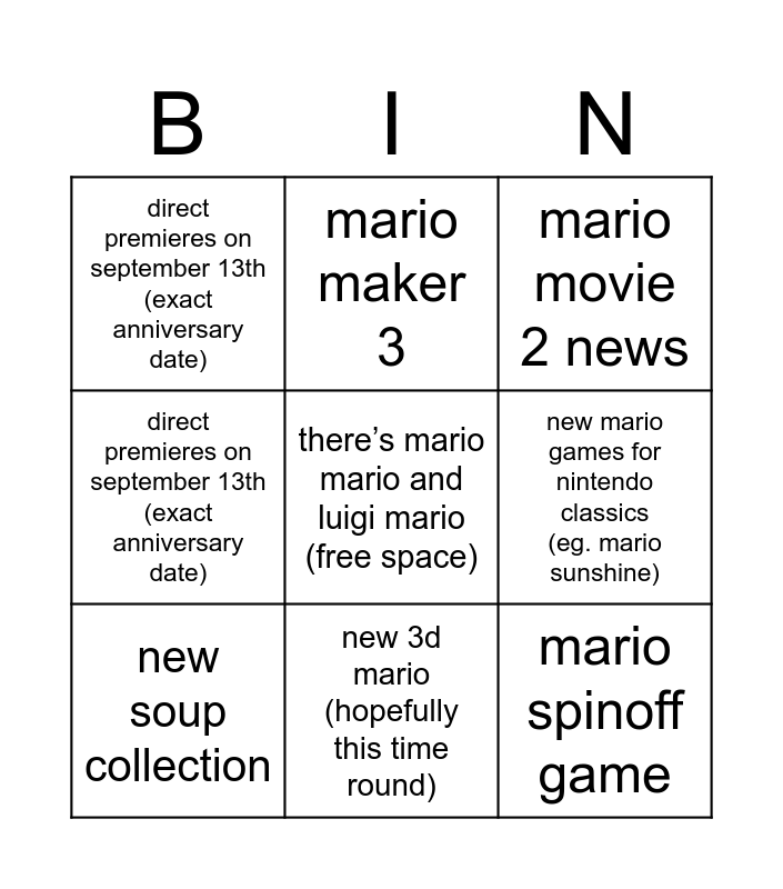 This bingo card has a free space and 11 words: direct premieres on september 13th (exact anniversary date), new 3d mario (hopefully this time round), mario spinoff game, new soup collection, mario maker 3, mario movie 2 news, new mario games for nintendo classics (eg. mario sunshine), exclusive anniversary merch, direct premieres on september 13th (exact anniversary date), direct premieres on september 13th (exact anniversary date) and direct premieres on september 13th (exact anniversary date).