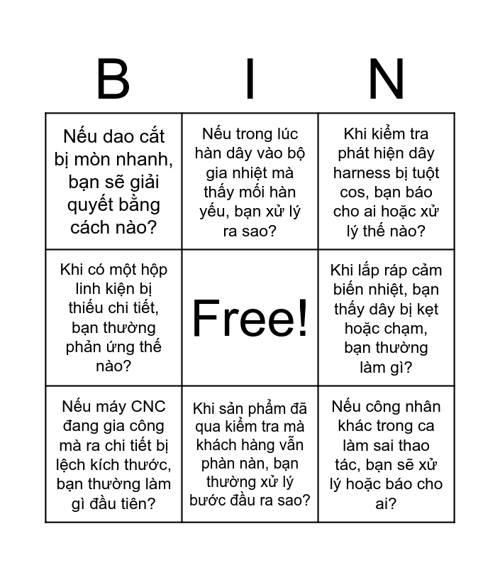 This bingo card has a free space and 9 words: Nếu máy CNC đang gia công mà ra chi tiết bị lệch kích thước, bạn thường làm gì đầu tiên?, Khi kiểm tra phát hiện dây harness bị tuột cos, bạn báo cho ai hoặc xử lý thế nào?, Nếu trong lúc hàn dây vào bộ gia nhiệt mà thấy mối hàn yếu, bạn xử lý ra sao?, Khi có một hộp linh kiện bị thiếu chi tiết, bạn thường phản ứng thế nào?, Nếu dao cắt bị mòn nhanh, bạn sẽ giải quyết bằng cách nào?, Khi lắp ráp cảm biến nhiệt, bạn thấy dây bị kẹt hoặc chạm, bạn thường làm gì?, Nếu công nhân khác trong ca làm sai thao tác, bạn sẽ xử lý hoặc báo cho ai?, Nếu phát hiện nguyên liệu đầu vào có vấn đề (không đúng kích thước, hư hỏng), bạn xử lý thế nào? and Khi sản phẩm đã qua kiểm tra mà khách hàng vẫn phàn nàn, bạn thường xử lý bước đầu ra sao?.