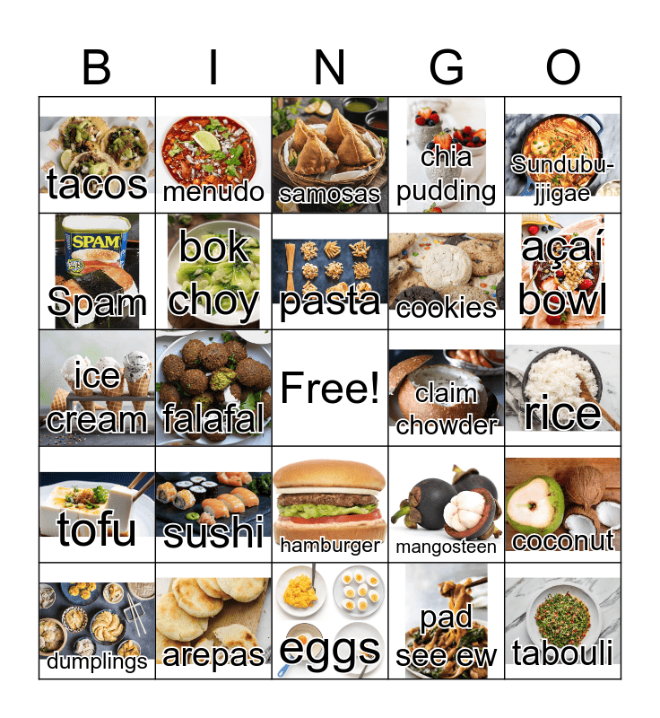 This bingo card has 24 images, a free space and 24 words: sushi, arepas, pasta, dumplings, Sundubu-jjigae, tacos, Spam, menudo, claim chowder, hamburger, cookies, ice cream, mangosteen, coconut, bok choy, pad see ew, rice, samosas, açaí bowl, falafal, tabouli, tofu, chia pudding and eggs.
