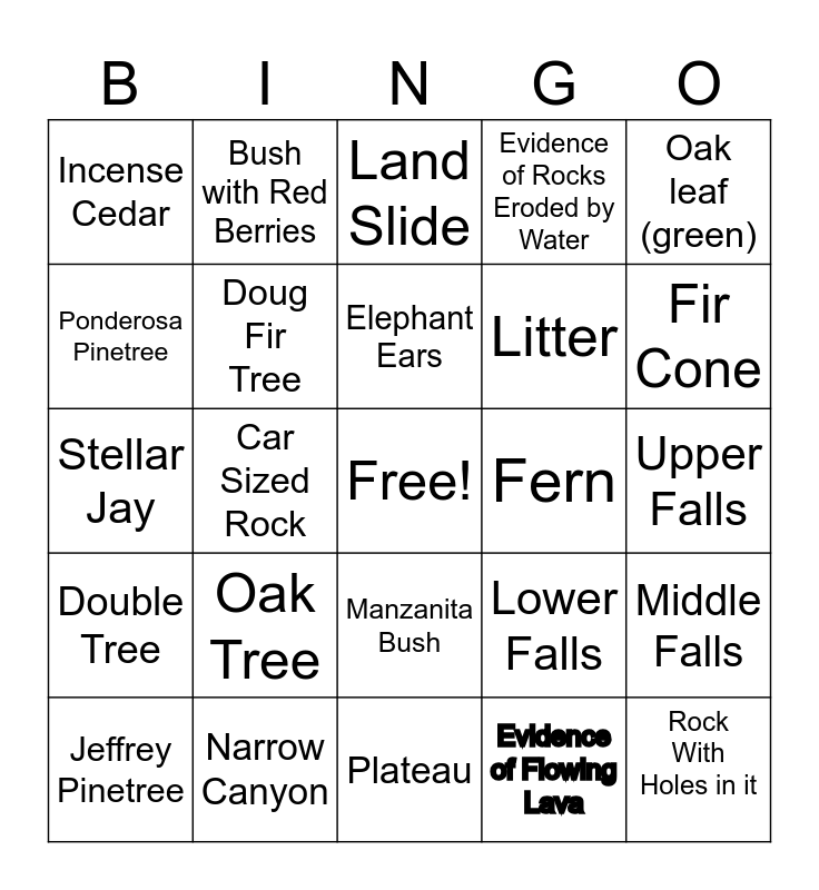 This bingo card has a free space and 24 words: Oak Tree, Narrow Canyon, Elephant Ears, Jeffrey Pinetree, Oak leaf (green), Incense Cedar, Ponderosa Pinetree, Bush with Red Berries, Fern, Manzanita Bush, Litter, Stellar Jay, Lower Falls, Middle Falls, Doug Fir Tree, Evidence of Flowing Lava, Upper Falls, Land Slide, Fir Cone, Car Sized Rock, Rock With Holes in it, Double Tree, Evidence of Rocks Eroded by Water and Plateau.