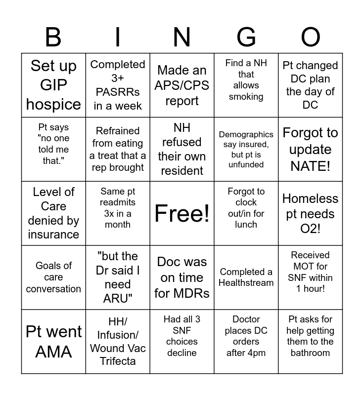 This bingo card has a free space and 38 words: Rep asks how they can get more referrals, All nurses were present & on time for MDRs, Nurse said no one answered when trying to call report to SNF, Refrained from eating a treat that a rep brought, Received MOT for SNF within 1 hour!, "but the Dr said I need ARU", NH refused their own resident, Got fired by a patient, Pt changed DC plan the day of DC, Demographics say insured, but pt is unfunded, Same pt readmits 3x in a month, Find a NH that allows smoking, Pt asks for help getting them to the bathroom, Homeless pt needs O2!, Pt says "no one told me that.", Goals of care conversation, Had a pt thank you for your help, Made an APS/CPS report, Had to call IT, Forgot to clock out/in for lunch, Set up GIP hospice, HH/ Infusion/ Wound Vac Trifecta, Forgot to update NATE!, Pt went AMA, Dealt with an angry family member, Had all 3 SNF choices decline, Pt appeals their DC, Therapy recommends ARU for an unfunded pt, Pt called you a "doctor", MOT in, but pt still here the next day, Homeless pt needs a home, Doc was on time for MDRs, Doctor places DC orders after 4pm, Completed 3+ PASRRs in a week, Arranging unfunded dialysis chair, Completed a Healthstream, Level of Care denied by insurance and Pt needed a ride home, but had no keys!.