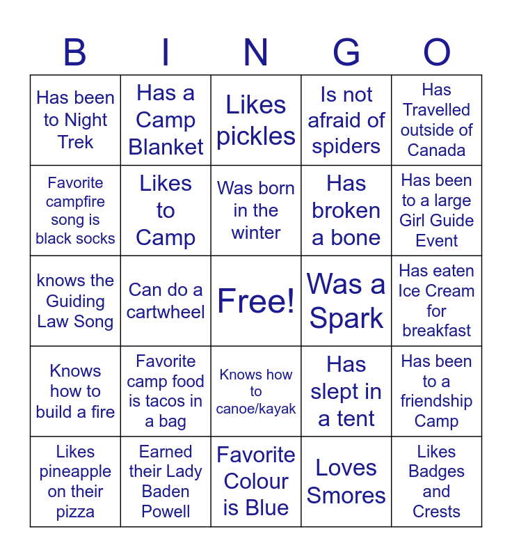 This bingo card has a free space and 24 words: Likes pineapple on their pizza, Favorite camp food is tacos in a bag, Was born in the winter, Loves Smores, Has Travelled outside of Canada, Has been to Night Trek, Has a Camp Blanket, Likes pickles, Was a Spark, Has eaten Ice Cream for breakfast, knows the Guiding Law Song, Likes to Camp, Has slept in a tent, Has been to a friendship Camp, Favorite campfire song is black socks, Earned their Lady Baden Powell, Favorite Colour is Blue, Is not afraid of spiders, Has been to a large Girl Guide Event, Knows how to build a fire, Can do a cartwheel, Knows how to canoe/kayak, Has broken a bone and Likes Badges and Crests.