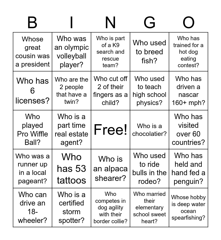 This bingo card has a free space and 24 words: Who has 53 tattoos, Who is a certified storm spotter?, Who cut off 2 of their fingers as a child?, Who can drive an 18-wheeler?, Who has trained for a hot dog eating contest?, Whose great cousin was a president, Who has 6 licenses?, Who was an olympic volleyball player?, Who is a chocolatier?, Who is an alpaca shearer?, Who used to teach high school physics?, Who played Pro Wiffle Ball?, Who used to ride bulls in the rodeo?, Who has held and hand fed a penguin?, Who are the 2 people that have a twin?, Who married their elementary school sweet heart?, Who has visited over 60 countries?, Who is part of a K9 search and rescue team?, Who has driven a nascar 160+ mph?, Who is a part time real estate agent?, Whose hobby is deep water ocean spearfishing?, Who was a runner up in a local pageant?, Who used to breed fish? and Who competes in dog agility with their border collie?.