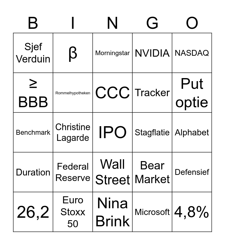 This bingo card has 48 words: Dow Jones, Federal Reserve, Beleggingshorizon, Microsoft, Defensief, 26,2, β, Jerome Powell, NVIDIA, Private equity, Sjef Verduin, Rommelhypotheken, Nina Brink, Bear Market, Bull Market, Duration, Christine Lagarde, IPO, Patricia van de Velde, NASDAQ, Benchmark, Indexbeleggen, Morningstar, Tracker, Effectief rendement, ≥ BBB, Euro Stoxx 50, AEX-index, Stagflatie, Alphabet, AAA, Beheerd Beleggen, ASML, 5,5%, 4,8%, 11,1%, Call optie, Wall Street, Robeco, AMX, BlackRock, Offensief, CCC, 30,5%, Put optie, Vermogensbeheer, 10,7 and Moody's.
