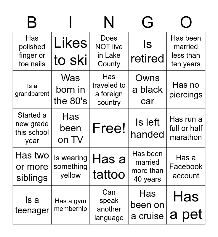 This bingo card has a free space and 24 words: Is wearing something yellow, Has a gym memberhip, Has traveled to a foreign country, Is a teenager, Has been married less than ten years, Has polished finger or toe nails, Is a grandparent, Likes to ski, Is left handed, Has a tattoo, Owns a black car, Started a new grade this school year, Has been married more than 40 years, Has a Facebook account, Was born in the 80's, Has been on a cruise, Has run a full or half marathon, Does NOT live in Lake County, Has no piercings, Has been on TV, Has a pet, Has two or more siblings, Is retired and Can speak another language.