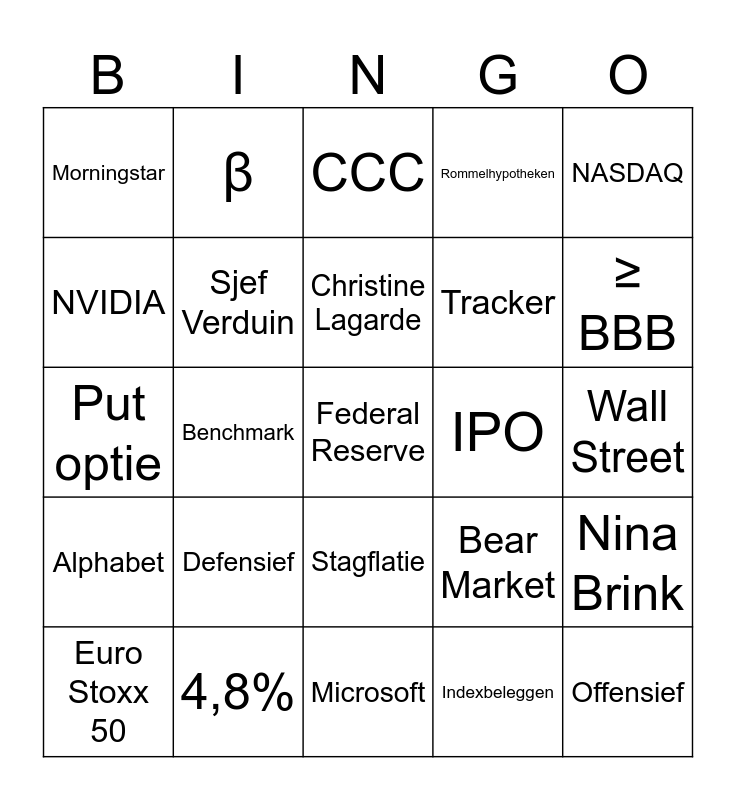This bingo card has 48 words: Dow Jones, Federal Reserve, Beleggingshorizon, Microsoft, Defensief, 26,2, β, Jerome Powell, NVIDIA, Private equity, Sjef Verduin, Rommelhypotheken, Nina Brink, Bear Market, Bull Market, 5,5%, Christine Lagarde, IPO, Patricia van de Velde, NASDAQ, Benchmark, Indexbeleggen, Morningstar, Tracker, Effectief rendement, ≥ BBB, Euro Stoxx 50, AEX-index, Stagflatie, Alphabet, AAA, Beheerd Beleggen, ASML, Duration, 4,8%, 11,1%, Call optie, Wall Street, Robeco, AMX, BlackRock, Offensief, CCC, 30,5%, Put optie, Vermogensbeheer, 10,7 and Moody's.