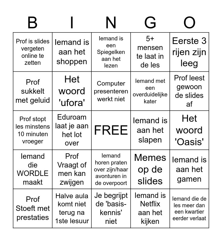 This bingo card has a free space and 24 words: Prof Stoeft met prestaties, Prof Vraagt of men kan zwijgen, Computer presenteren werkt niet, Iemand is Netflix aan het kijken, Eerste 3 rijen zijn leeg, Prof is slides vergeten online te zetten, Iemand is aan het shoppen, Iemand is een Spiegelken aan het lezen, Iemand is aan het slapen, Het woord 'Oasis', Prof stopt les minstens 10 minuten vroeger, Het woord 'ufora', Memes op de slides, Iemand is aan het gamen, Prof sukkelt met geluid, Halve aula komt niet terug na 1ste lesuur, Je begrijpt de 'basis-kennis' niet, 5+ mensen te laat in de les, Prof leest gewoon de slides af, Iemand die WORDLE maakt, Eduroam laat je aan het lot over, Iemand horen praten over zijn/haar avonturen in de overpoort, Iemand met een overduidelijke kater and Iemand die de les meer dan een kwartier eerder verlaat.