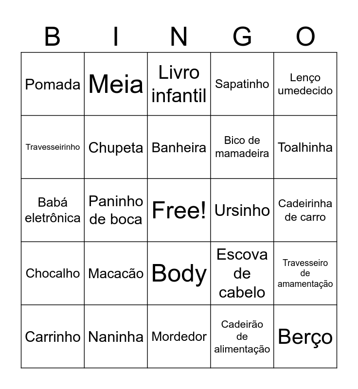 This bingo card has 1 images, a free space and 38 words: Fralda, Mamadeira, Chupeta, Carrinho, Body, Banheira, Babador, Lenço umedecido, Chocalho, Paninho de boca, Sapatinho, Berço, Cadeirinha de carro, Ursinho, Macacão, Trocador, Pomada, Termômetro, Escova de cabelo, Travesseirinho, Mordedor, Bico de mamadeira, Toalhinha, Cueiro, Pratinho, Colônia de bebê, Talco, Bolsa maternidade, Meia, Manta, Almofada de amamentação, Livro infantil, Naninha, Cadeirão de alimentação, Luvinha, Travesseiro de amamentação, Babá eletrônica and Mobile de berço.