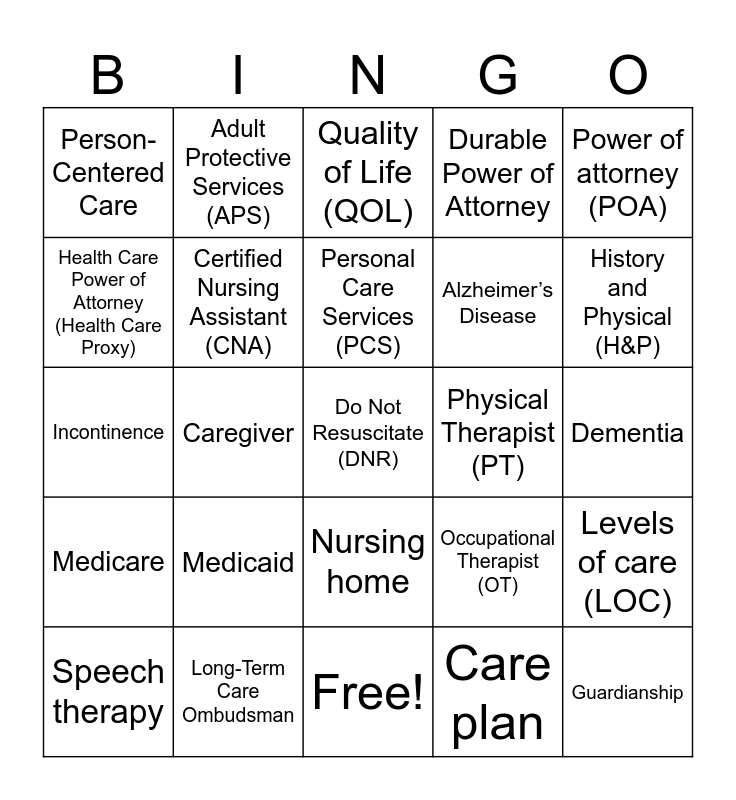 This bingo card has 31 words: Free!, Activities of Daily Living (ADL), Caregiver, Aging in Place, Person-Centered Care, Quality of Life (QOL), Certified Nursing Assistant (CNA), Occupational Therapist (OT), Physical Therapist (PT), Care plan, Dementia, Do Not Resuscitate (DNR), Guardianship, Hands-on assistance, History and Physical (H&P), Hospice care, Levels of care (LOC), Medicaid, Medicare, Nursing home, Power of attorney (POA), Rehabilitation, Speech therapy, Adult Protective Services (APS), Alzheimer’s Disease, Health Care Power of Attorney (Health Care Proxy), Durable Power of Attorney, Incontinence, Long-Term Care Ombudsman, Personal Care Services (PCS) and Primary Care Physician (PCP).