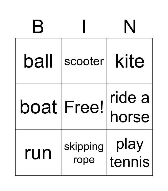 This bingo card has a free space and 18 words: teddy, doll, kite, ball, robot, boat, yoyo, scooter, skipping rope, skateboard, play football, play tennis, ride a bike, ride a horse, run, rollerblade, swim and play basketball.