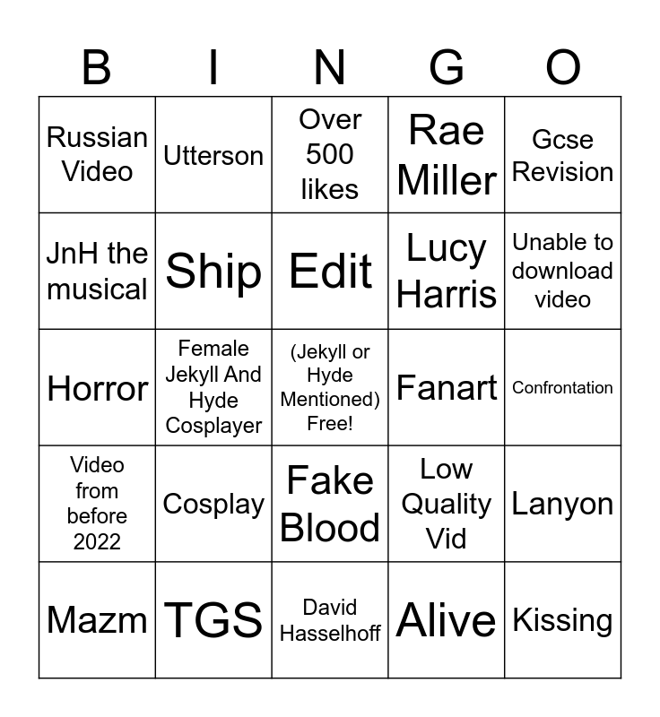 This bingo card has a free space and 24 words: Cosplay, TGS, Edit, Mazm, Gcse Revision, Russian Video, JnH the musical, Utterson, Fanart, Fake Blood, Lucy Harris, Horror, Low Quality Vid, Lanyon, Ship, Alive, Confrontation, Over 500 likes, Unable to download video, Female Jekyll And Hyde Cosplayer, Kissing, Video from before 2022, Rae Miller and David Hasselhoff.