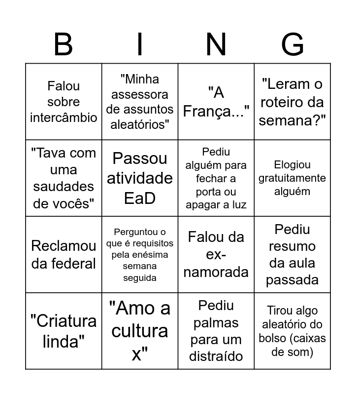 This bingo card has 16 words: "Criatura linda", "Amo a cultura x", "A França...", "Leram o roteiro da semana?", "Tava com uma saudades de vocês", "Minha assessora de assuntos aleatórios", Falou da ex-namorada, Pediu resumo da aula passada, Falou sobre intercâmbio, Passou atividade EaD, Pediu palmas para um distraído, Elogiou gratuitamente alguém, Reclamou da federal, Perguntou o que é requisitos pela enésima semana seguida, Pediu alguém para fechar a porta ou apagar a luz and Tirou algo aleatório do bolso (caixas de som).