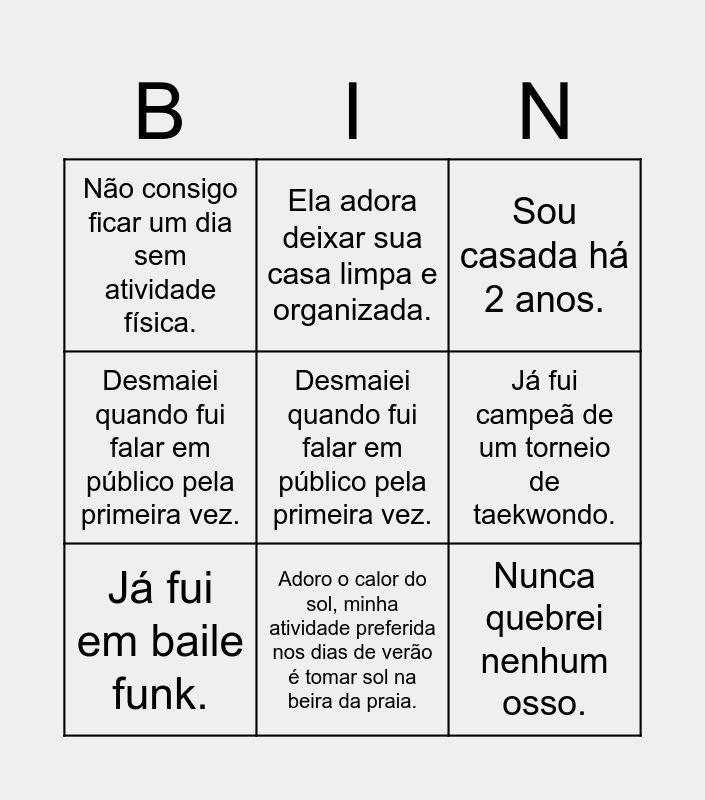 This bingo card has 96 words: Eu tenho 1,51 de altura e tenho um filho de 20 anos com 1,80 de altura., Minha comida favorita é pizza de sardinha, Uma das coisas que mais gosto de fazer é estudar, Sou apaixonada por minha família, Free!, Adoro ficar em casa, organizar as coisas e assistir um bom filme, Não sou uma boa ouvinte e sim uma boa locutora., Sou carioca, Sou educado, Sou sincero, Eu faço coisas que a maioria das pessoas não sabem como eu faço, eu não sei como eu faço, mas faço! Ex, pintar minha, fazer croche..., Tenho gostos gastronômicos estranhos, tipo comer pão com maionese e goiabada., Amo viajar e a viagem que eu mais gostei foi para a Itália!, Já toquei guitarra na banda da igreja., Já dancei em um restaurante na argentina., Já fui campeã de um torneio de taekwondo., Adoro o calor do sol, minha atividade preferida nos dias de verão é tomar sol na beira da praia., Na invernada do CTG, me dedico a ser prenda e me aperfeiçoar em nossas danças tradicionais, cultuando nossa tradição., Por morar em uma cidade litorânea, acabei adaptando meu paladar e aprecio muito frutos do mar, especialmente peixe cru recém pescado., Chateada porque não estarei no The Town para ver meus Backstreet Boys., Tenho um gato preto chamado Tito., Ano que vem estarei quarentando., Sou uma pessoa desinibida., Adoro escutar músicas., Adoro ver vídeos de faxina "acelerada" no Instagram., Sou café em forma de gente., Adoro filmes de terror., Não consigo ficar um dia sem atividade física., Eu gosto de tomar chimarrão., Já conheci a Neve., Eu não tenho pressa. Tenho urgência em tudo., Já fui em baile funk., Meu 1º amor foi o rei Roberto Carlos., Nunca quebrei nenhum osso., Desmaiei quando fui falar em público pela primeira vez., Fiz programa de Rádio., Já viajei pra cinco estados do Brasil., Trinquei o fêmur brincando de pega-pega com meu cachorro. Tive que ser segurado(a) na cadeira da montanha-russa porque era muito pequeno(a) e estava quase escorregando. Quebrei o braço caindo do sofá., Não gosto de musica., Detesto rotina, amo sair viajar., Amo me montar mesmo que seja pra ficar em casa., Sou apaixonada pelo Ricky Martin., Amo pagode, e ja dancei no palco de um evento., Não gosto da Disney., Tenho uma irmã gêmea e sou a mais nova., Sou casada há 2 anos., Sou timida., Eu tenho 1,51 de altura e tenho um filho de 20 anos com 1,80 de altura., Minha comida favorita é pizza de sardinha, Uma das coisas que mais gosto de fazer é estudar, Sou apaixonada por minha família, Adoro ficar em casa, organizar as coisas e assistir um bom filme, Não sou uma boa ouvinte e sim uma boa locutora., Sou carioca, Sou educado, Sou sincero, Eu faço coisas que a maioria das pessoas não sabem como eu faço, eu não sei como eu faço, mas faço! Ex, pintar minha, fazer croche..., Tenho gostos gastronômicos estranhos, tipo comer pão com maionese e goiabada., Amo viajar e a viagem que eu mais gostei foi para a Itália!, Já toquei guitarra na banda da igreja., Já dancei em um restaurante na argentina., Já fui campeã de um torneio de taekwondo., Adoro o calor do sol, minha atividade preferida nos dias de verão é tomar sol na beira da praia., Na invernada do CTG, me dedico a ser prenda e me aperfeiçoar em nossas danças tradicionais, cultuando nossa tradição., Por morar em uma cidade litorânea, acabei adaptando meu paladar e aprecio muito frutos do mar, especialmente peixe cru recém pescado., Chateada porque não estarei no The Town para ver meus Backstreet Boys., Tenho um gato preto chamado Tito., Ano que vem estarei quarentando., Sou uma pessoa desinibida., Adoro escutar músicas., Adoro ver vídeos de faxina "acelerada" no Instagram., Sou café em forma de gente., Adoro filmes de terror., Não consigo ficar um dia sem atividade física., Eu gosto de tomar chimarrão., Já conheci a Neve., Eu não tenho pressa. Tenho urgência em tudo., Já fui em baile funk., Meu 1º amor foi o rei Roberto Carlos., Nunca quebrei nenhum osso., Desmaiei quando fui falar em público pela primeira vez., Fiz programa de Rádio., Já viajei pra cinco estados do Brasil., Trinquei o fêmur brincando de pega-pega com meu cachorro. Tive que ser segurado(a) na cadeira da montanha-russa porque era muito pequeno(a) e estava quase escorregando. Quebrei o braço caindo do sofá., Não gosto de musica., Detesto rotina, amo sair viajar., Amo me montar mesmo que seja pra ficar em casa., Sou apaixonada pelo Ricky Martin., Amo pagode, e ja dancei no palco de um evento., Não gosto da Disney., Tenho uma irmã gêmea e sou a mais nova., Sou casada há 2 anos., Sou timida., Ela é muito extrovertida e falante., Ela adora deixar sua casa limpa e organizada. and É cheia de manias para limpeza..