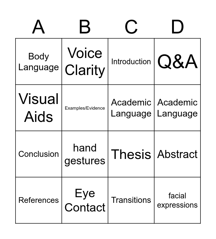 This bingo card has 20 words: Abstract, Clear Topic/Title Slide, Introduction, Time Management, References, Visual Aids, Eye Contact, Body Language, Conclusion, Voice Clarity, hand gestures, Thesis, Examples/Evidence, facial expressions, Academic Language, hook, Academic Language, Q&A, Transitions and Methodology.