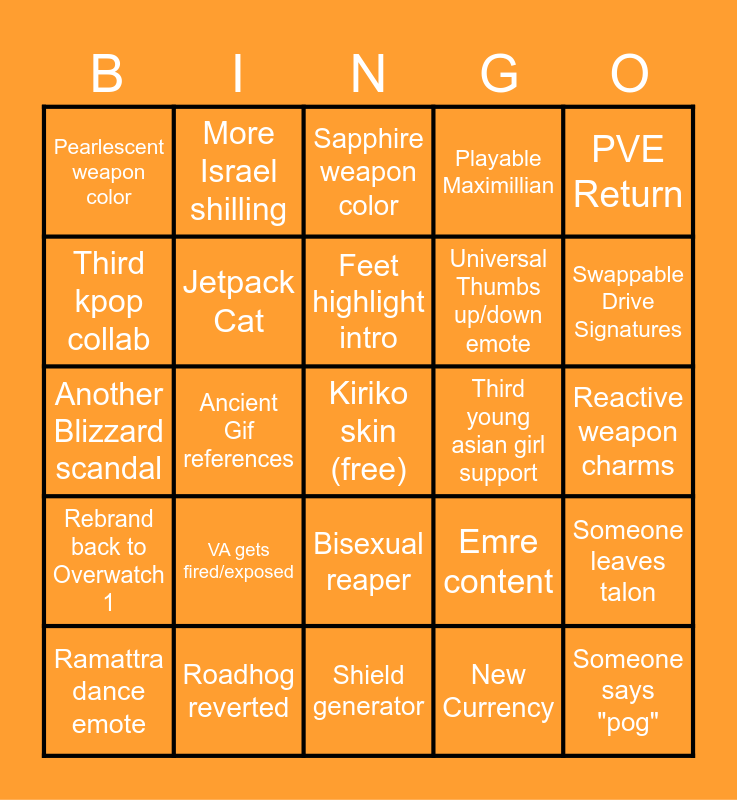 This bingo card has a free space and 24 words: VA gets fired/exposed, Roadhog reverted, Feet highlight intro, Ramattra dance emote, PVE Return, Pearlescent weapon color, Third kpop collab, More Israel shilling, Third young asian girl support, Bisexual reaper, Universal Thumbs up/down emote, Another Blizzard scandal, Emre content, Someone leaves talon, Jetpack Cat, New Currency, Reactive weapon charms, Sapphire weapon color, Swappable Drive Signatures, Ancient Gif references, Someone says "pog", Rebrand back to Overwatch 1, Playable Maximillian and Shield generator.