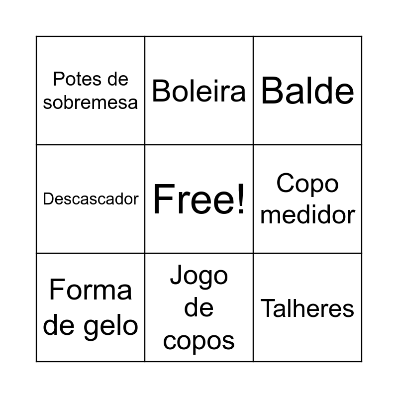 This bingo card has a free space and 25 words: Pano de prato, Espremedor, Jogo de copos, Jarra, Talheres, Potes de sobremesa, Copo medidor, Boleira, Queijeira, Porta frios, Amolador, Faqueiro, Porta temperos, Tábua, Forma de gelo, Escorredor, Pote hermético, Balde, Assadeira, Abridor, Pregador, Peneira, Funil, Descascador and Rodo de pia.