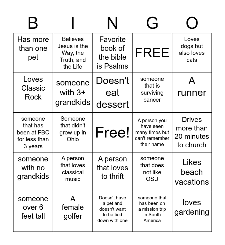 This bingo card has a free space and 29 words: someone over 6 feet tall, A great cook, Someone that didn't grow up in Ohio, someone that graduated from LFBI, Has more than one pet, Favorite book of the bible is Psalms, someone with 3+ grandkids, A person that loves classical music, A person you have seen many times but can't remember their name, A female golfer, Drives more than 20 minutes to church, loves gardening, Doesn't have a pet and doesn't want to be tied down with one, someone that has been on a mission trip in South America, A runner, A female that likes to fish or hunt, A person that loves to thrift, someone with no grandkids, Loves dogs but also loves cats, someone that has been at FBC for less than 3 years, someone that does not like OSU, Great at grilling, someone that is surviving cancer, Loves Classic Rock, FREE, Believes Jesus is the Way, the Truth, and the Life, Likes beach vacations, Doesn't eat dessert and Doesn't eat breakfast.