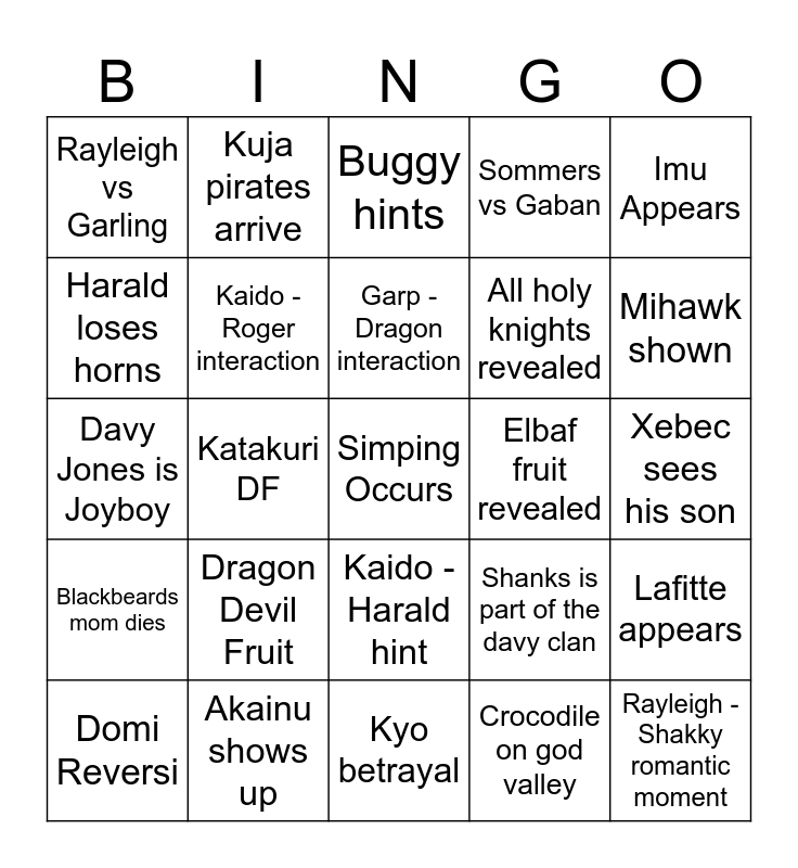 This bingo card has a free space and 24 words: Dragon Devil Fruit, Akainu shows up, Garp - Dragon interaction, Domi Reversi, Imu Appears, Rayleigh vs Garling, Harald loses horns, Kuja pirates arrive, Elbaf fruit revealed, Kaido - Harald hint, All holy knights revealed, Davy Jones is Joyboy, Shanks is part of the davy clan, Lafitte appears, Kaido - Roger interaction, Crocodile on god valley, Xebec sees his son, Buggy hints, Mihawk shown, Katakuri DF, Rayleigh - Shakky romantic moment, Blackbeards mom dies, Sommers vs Gaban and Kyo betrayal.