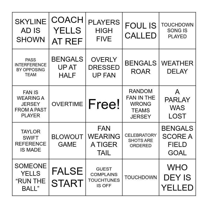 This bingo card has a free space and 60 words: BURROW THROWS A TOUCHDOWN TO CHASE, FALSE START, SEXUAL INNUENDO IS YELLED, TAYLOR SWIFT REFERENCE IS MADE, TOUCHDOWN, A TV REQUEST IS MADE IN THE MIDDLE OF THE GAME, BENGALS UP AT HALF, PLAYER DOES A TOUCHDOWN CELEBRATION, BENGALS ROAR, SHOT OF A SAD FAN IS SHOWN, FOUL IS CALLED, PASS INTERFERENCE BY BENGALS, PASS INTERFERENCE BY OPPOSING TEAM, COACH SEEN YELLING AT PLAYER, PLAYER YELLING AT COACH, SKYLINE AD IS SHOWN, WHO DEY IS YELLED, TOUCHDOWN SONG IS PLAYED, FAKE PUNT, OVERLY DRESSED UP FAN, RANDOM FAN IN THE WRONG TEAMS JERSEY, PLAYERS HIGH FIVE, SOMEONE YELLS “RUN THE BALL”, BENGALS SCORE A FIELD GOAL, CLOSE UP SHOT OF THE BEN-GALS, WELCOME TO THE JUNGLE IS PLAYED, OPPOSING TEAM MISSES A FIELD GOAL, OPPOSING TEAM BOOS THE BENGALS, WEATHER DELAY, WEATHER CHANGES DURING GAME, LACK OF GAMEBALL IS MENTIONED, REF MISSES AN OBVIOUS CALL, FIGHT BREAKS OUT, PLAYER YELLS AT REF, COACH YELLS AT REF, BENGALS WIN!, BENGALS DOWN AT HALF, OVERTIME, SOMEONE ASKS “WHATS THE NAME OF THIS BAR?”, FAN IS WEARING A JERSEY FROM A PAST PLAYER, SOMEONE YELLS AT THE TV, BLOWOUT GAME, A PARLAY WAS LOST, A PARLAY WAS WON, CELEBRATORY SHOTS ARE ORDERED, PENTALTY WAS CALLED, PLAY REVIEWED, FAN HAS TIGER FACE PAINT, FAN WEARING TIGER EARS, FAN WEARING A TIGER TAIL, GUEST COMPLAINS TOUCHTUNES IS OFF, FOOTBALL OBLIVIOUS CUSTOMER, OBVIOUSLY HUNGOVER CUSTOMER, SOMEONE IS DRUNK BY HALFTIME, WING SAUCE BOTTLE IS DROPPED, GUEST IS MORE INTO A DIFFERENT GAME, GUEST CHEERS AT THE WRONG TIME, SOMEONE ARGUES WITH THE BARTENDER ABOUT TVS, GUEST GETS CUT OFF and DISGRUNTLED FAN FOR THE OPPOSING TEAM.