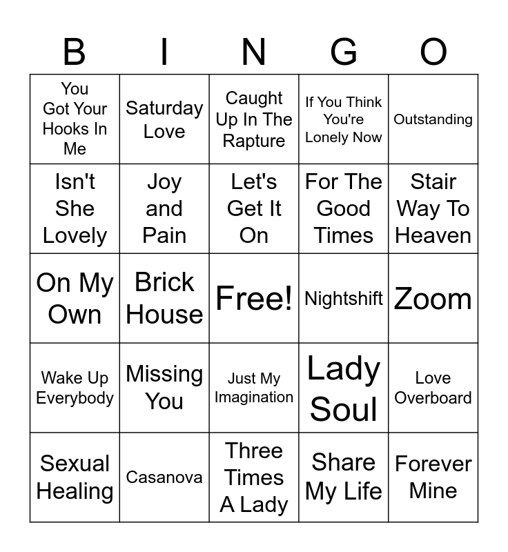 This bingo card has a free space and 39 words: You Dropped a Bomb on Me, Turn Off the Lights, Across 110th Street, Joy and Pain, Sexual Healing, Just My Imagination, Let's Get It On, Easy, Outstanding, Wake Up Everybody, Brick House, If You Think You're Lonely Now, Forever Mine, Zoom, Nightshift, Missing You, Before I Let Go, You Got Your Hooks In Me, I Miss You, Lady Soul, Isn't She Lovely, Three Times A Lady, For The Good Times, Stair Way To Heaven, Still, We ARE ONE, Distant Lover, Early In The Morning, Tears, Saturday Love, After The Pain, Brandy, Caught Up In The Rapture, Casanova, Share My Life, Don't Look Any Further, Love Overboard, On My Own and Never Too Much.