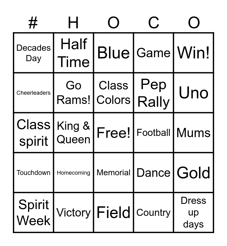 This bingo card has a free space and 24 words: Homecoming, Victory, Class Colors, Spirit Week, Win!, Decades Day, Cheerleaders, Half Time, Football, Memorial, Pep Rally, Class spirit, Dance, Gold, Go Rams!, Country, Mums, Blue, Uno, King & Queen, Dress up days, Touchdown, Game and Field.