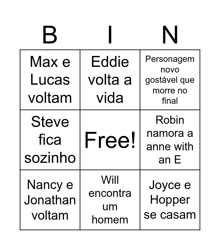 This bingo card has a free space and 11 words: Eleven mata o vilão gritando e usando poder, Will encontra um homem, Joyce e Hopper se casam, Nancy e Jonathan voltam, Eddie volta a vida, Personagem novo gostável que morre no final, Robin namora a anne with an E, Dustin termina com a suzie, Steve fica sozinho, Max e Lucas voltam and Mike e Eleven ficam juntos.