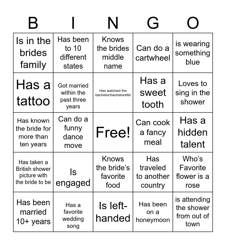 This bingo card has a free space and 29 words: Has been married 10+ years, Has been to a wedding this year, Can do a funny dance move, Love chocolate, Is in the brides family, Knows the brides middle name, Got married within the past three years, Is engaged, Can cook a fancy meal, Has a favorite wedding song, Has a hidden talent, is attending the shower from out of town, Is left-handed, Has been on a honeymoon, Loves to sing in the shower, Has a pet, Knows the bride’s favorite food, Has taken a British shower picture with the bride to be, is wearing something blue, Has known the bride for more than ten years, Has traveled to another country, Knows the groom, Has a sweet tooth, Has a tattoo, Can do a cartwheel, Has been to 10 different states, Who’s Favorite flower is a rose, Has watched the bachelor/bachelorette and Has been a plus one to a wedding.