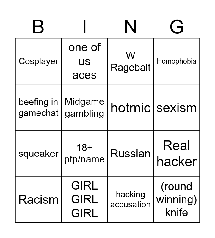 This bingo card has 16 words: Racism, GIRL GIRL GIRL, W Ragebait, Homophobia, beefing in gamechat, one of us aces, Russian, Real hacker, Cosplayer, Midgame gambling, hacking accusation, sexism, squeaker, 18+ pfp/name, hotmic and (round winning) knife.
