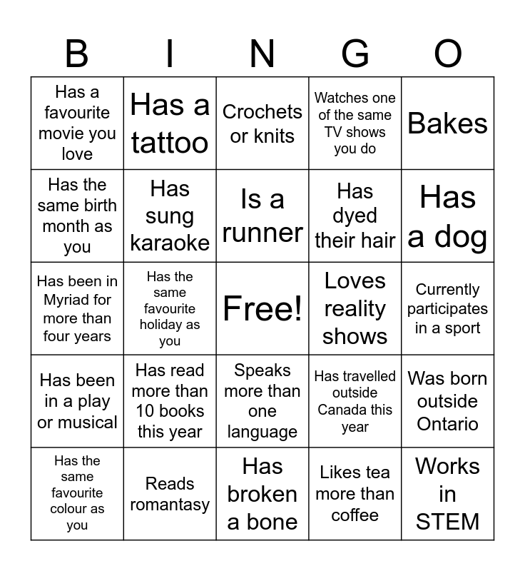 This bingo card has a free space and 29 words: Has the same favourite colour as you, Has the same favourite season as you, Has the same favourite holiday as you, Has the same favourite music genre as you, Has a favourite movie you love, Crochets or knits, Has sung karaoke, Has read more than 10 books this year, Loves reality shows, Reads romantasy, Currently participates in a sport, Works in STEM, Has broken a bone, Likes tea more than coffee, Has a dog, Plays an instrument, Speaks more than one language, Has been in a play or musical, Bakes, Has been in Myriad for more than four years, Has travelled outside Canada this year, Has seen a concert this year, Has dyed their hair, Has the same birth month as you, Watches one of the same TV shows you do, Has a tattoo, Was born outside Ontario, Is a runner and Loves to cook.