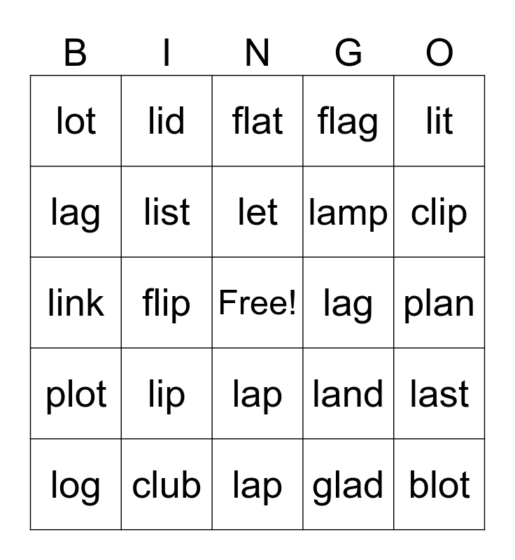 This bingo card has a free space and 25 words: lip, lap, let, log, lit, lot, lag, lid, lag, lap, lamp, link, land, last, list, clam, plan, flat, clip, flip, blot, club, plot, flag and glad.