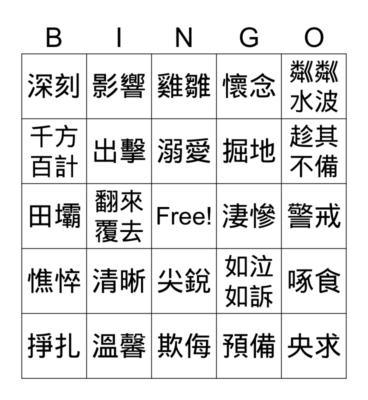 This bingo card has a free space and 24 words: 清晰, 溫馨, 溺愛, 掙扎, 粼粼水波, 深刻, 千方百計, 影響, 淒慘, 尖銳, 掘地, 田壩, 如泣如訴, 啄食, 出擊, 預備, 警戒, 雞雛, 趁其不備, 翻來覆去, 央求, 憔悴, 懷念 and 欺侮.