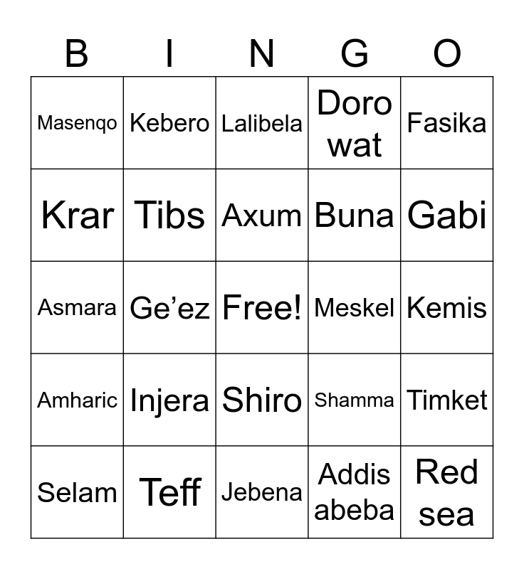 This bingo card has a free space and 24 words: Injera, Teff, Axum, Selam, Fasika, Masenqo, Krar, Kebero, Meskel, Shiro, Buna, Asmara, Shamma, Timket, Tibs, Addis abeba, Kemis, Lalibela, Gabi, Ge’ez, Red sea, Amharic, Doro wat and Jebena.