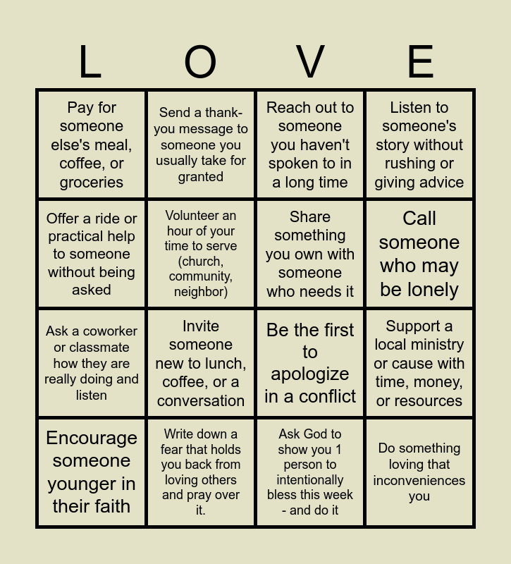 This bingo card has 24 words: Write a handwritten note/letter of encouragement to someone, Bring food, coffee, or a treat to bless someone unexpectedly, Call someone who may be lonely, Choose to forgive someone even if they haven't asked, Offer a ride or practical help to someone without being asked, Pay for someone else's meal, coffee, or groceries, Volunteer an hour of your time to serve (church, community, neighbor), Send a thank-you message to someone you usually take for granted, Write down a fear that holds you back from loving others and pray over it., Pray specifically for someone who has hurt you, Ask a coworker or classmate how they are really doing and listen, Be the first to apologize in a conflict, Give someone a genuine compliment about their character, not appearance, Surprise someone with an act of generosity, Share something you own with someone who needs it, Offer encouragement to someone who is struggling spiritually, Ask God to show you 1 person to intentionally bless this week - and do it, Reach out to someone you haven't spoken to in a long time, Invite someone new to lunch, coffee, or a conversation, Support a local ministry or cause with time, money, or resources, Encourage someone younger in their faith, Do something loving that inconveniences you, Listen to someone's story without rushing or giving advice and Pray over someone out loud if they're comfortable.