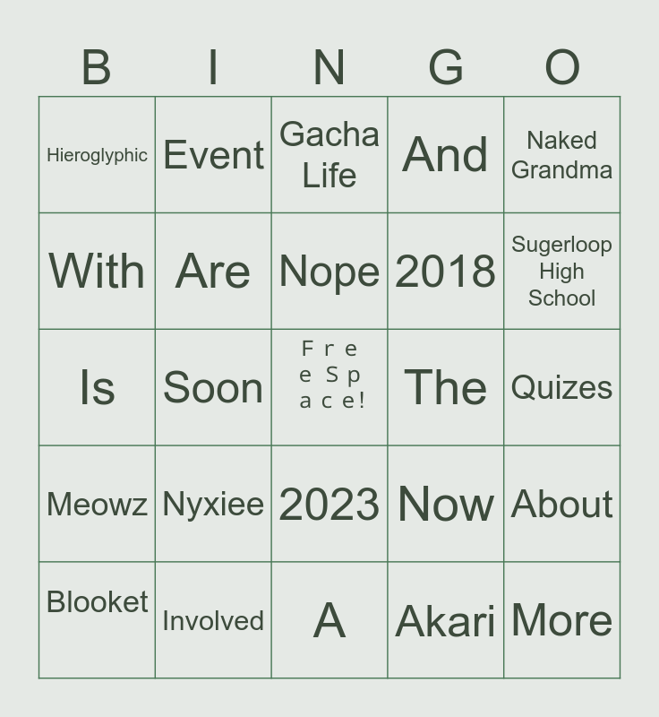 This bingo card has a free space and 24 words: Blooket, Nyxiee, Nope, Akari, Naked Grandma, Hieroglyphic, Event, Gacha Life, The, Quizes, Is, Are, Now, About, With, Involved, A, And, Sugerloop High School, Meowz, Soon, 2023, 2018 and More.