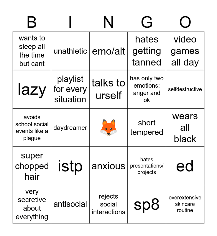 This bingo card has a free space and 24 words: istp, antisocial, talks to urself, very secretive about everything, video games all day, wants to sleep all the time but cant, lazy, unathletic, short tempered, anxious, has only two emotions: anger and ok, avoids school social events like a plague, hates presentations/ projects, ed, playlist for every situation, sp8, wears all black, emo/alt, selfdestructive, daydreamer, overextensive skincare routine, super chopped hair, hates getting tanned and rejects social interactions.