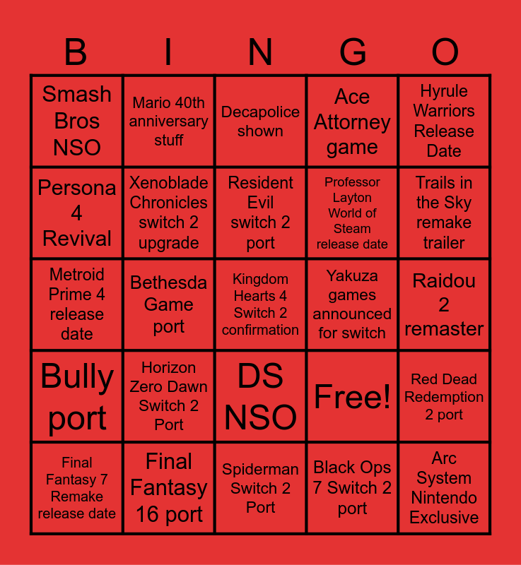 This bingo card has 25 words: Horizon Zero Dawn Switch 2 Port, Spiderman Switch 2 Port, Resident Evil switch 2 port, Final Fantasy 7 Remake release date, Hyrule Warriors Release Date, Smash Bros NSO, Persona 4 Revival, Mario 40th anniversary stuff, Yakuza games announced for switch, DS NSO, Professor Layton World of Steam release date, Metroid Prime 4 release date, Free!, Red Dead Redemption 2 port, Xenoblade Chronicles switch 2 upgrade, Arc System Nintendo Exclusive, Raidou 2 remaster, Decapolice shown, Trails in the Sky remake trailer, Bethesda Game port, Kingdom Hearts 4 Switch 2 confirmation, Final Fantasy 16 port, Bully port, Ace Attorney game and Black Ops 7 Switch 2 port.