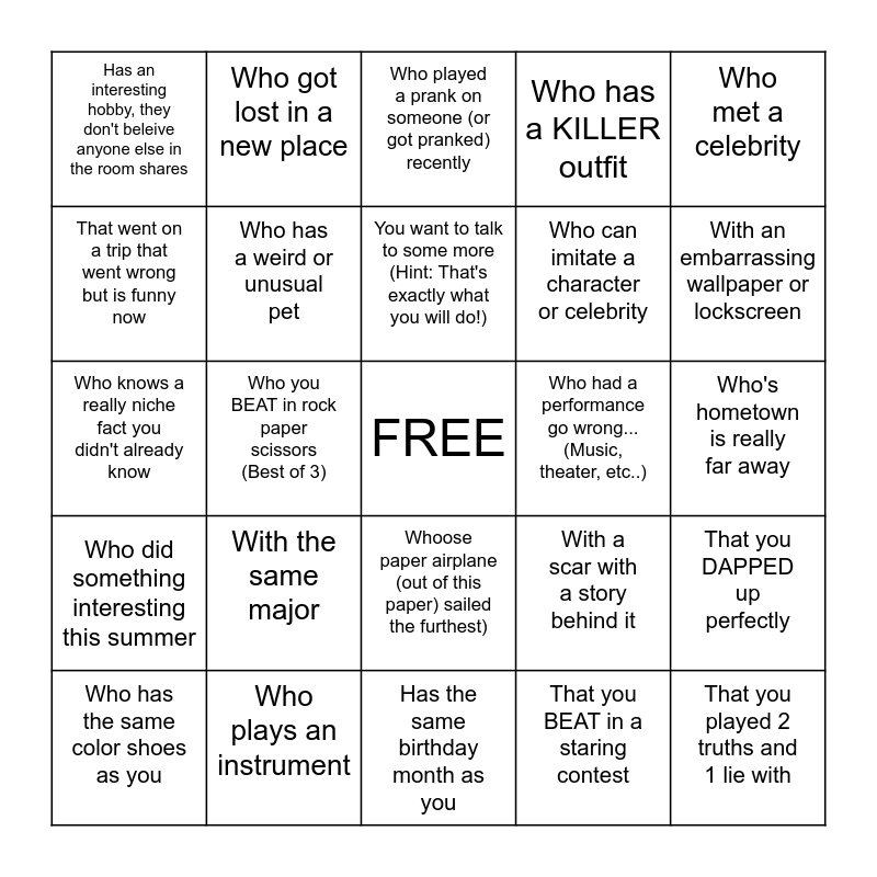 This bingo card has a free space and 24 words: With the same major, Who plays an instrument, You want to talk to some more (Hint: That's exactly what you will do!), Who has the same color shoes as you, Who met a celebrity, Has an interesting hobby, they don't beleive anyone else in the room shares, That went on a trip that went wrong but is funny now, Who got lost in a new place, Who had a performance go wrong... (Music, theater, etc..), Whoose paper airplane (out of this paper) sailed the furthest), Who can imitate a character or celebrity, Who knows a really niche fact you didn't already know, With a scar with a story behind it, That you DAPPED up perfectly, Who has a weird or unusual pet, That you BEAT in a staring contest, Who's hometown is really far away, Who played a prank on someone (or got pranked) recently, With an embarrassing wallpaper or lockscreen, Who you BEAT in rock paper scissors (Best of 3), That you played 2 truths and 1 lie with, Who did something interesting this summer, Who has a KILLER outfit and Has the same birthday month as you.