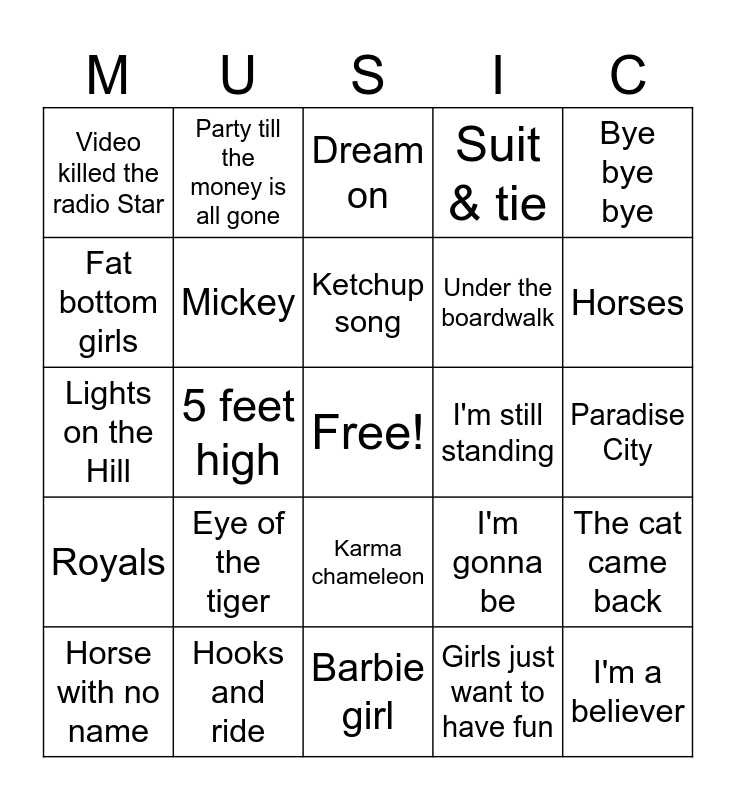 This bingo card has a free space and 63 words: Fast food song, Mr clickety cane, Bad hair day, The cat came back, Nutbush City limits, Drive it to the wheels fall off, Party till the money is all gone, Something in the pilliga, Ketchup song, Footloose, Karma chameleon, Witch doctor, Paradise City, Bye bye bye, I feel like a woman, Fat bottom girls, 5 feet high, Video killed the radio Star, Mr Boombastic, Under the boardwalk, Eye of the tiger, Royals, Suit & tie, Crocodile rock, Sweet home Alabama, Made in the USA, Warwick avenue, Tough ones, Jesus saves, Raised like that, Same songs, Fancy like, Purple people eater, Achy breaky heart, Horses, Horse with no name, Sweet Caroline, Girls just want to have fun, My Sharona, Mickey, Lights on the Hill, I'm still standing, Ice cream freeze, Agadoo, I'm a believer, Hooks and ride, Fast car, I'm gonna be, My people, The flood of 95, Yellow submarine, Barbie girl, C'est la vie, A bar song called tipsy, YMCA, Dream on, Piano man, Rocket man, It's raining men, Hoedown throwdown, Johnny be good, Good vibrations and Macarena.