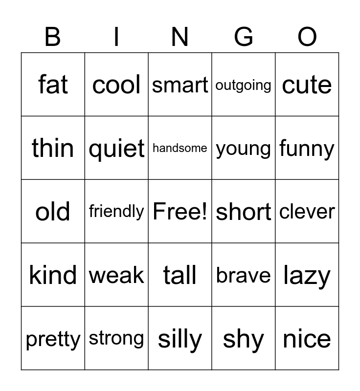 This bingo card has a free space and 24 words: weak, strong, handsome, pretty, cute, fat, thin, cool, short, tall, young, old, brave, lazy, quiet, shy, clever, smart, funny, friendly, nice, kind, outgoing and silly.