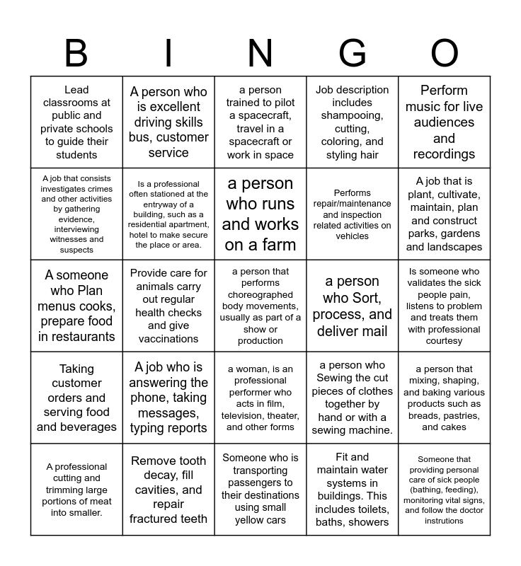 This bingo card has a free space and 24 words: A professional cutting and trimming large portions of meat into smaller., A job who is answering the phone, taking messages, typing reports, a person who runs and works on a farm, Fit and maintain water systems in buildings. This includes toilets, baths, showers, Perform music for live audiences and recordings, Lead classrooms at public and private schools to guide their students, A person who is excellent driving skills bus, customer service, a person trained to pilot a spacecraft, travel in a spacecraft or work in space, a person who Sort, process, and deliver mail, Is someone who validates the sick people pain, listens to problem and treats them with professional courtesy, A someone who Plan menus cooks, prepare food in restaurants, Is a professional often stationed at the entryway of a building, such as a residential apartment, hotel to make secure the place or area., a person who Sewing the cut pieces of clothes together by hand or with a sewing machine., a person that mixing, shaping, and baking various products such as breads, pastries, and cakes, A job that consists investigates crimes and other activities by gathering evidence, interviewing witnesses and suspects, Remove tooth decay, fill cavities, and repair fractured teeth, Someone who is transporting passengers to their destinations using small yellow cars, Job description includes shampooing, cutting, coloring, and styling hair, A job that is plant, cultivate, maintain, plan and construct parks, gardens and landscapes, Taking customer orders and serving food and beverages, Provide care for animals carry out regular health checks and give vaccinations, a woman, is an professional performer who acts in film, television, theater, and other forms, Performs repair/maintenance and inspection related activities on vehicles and Someone that providing personal care of sick people (bathing, feeding), monitoring vital signs, and follow the doctor instrutions.