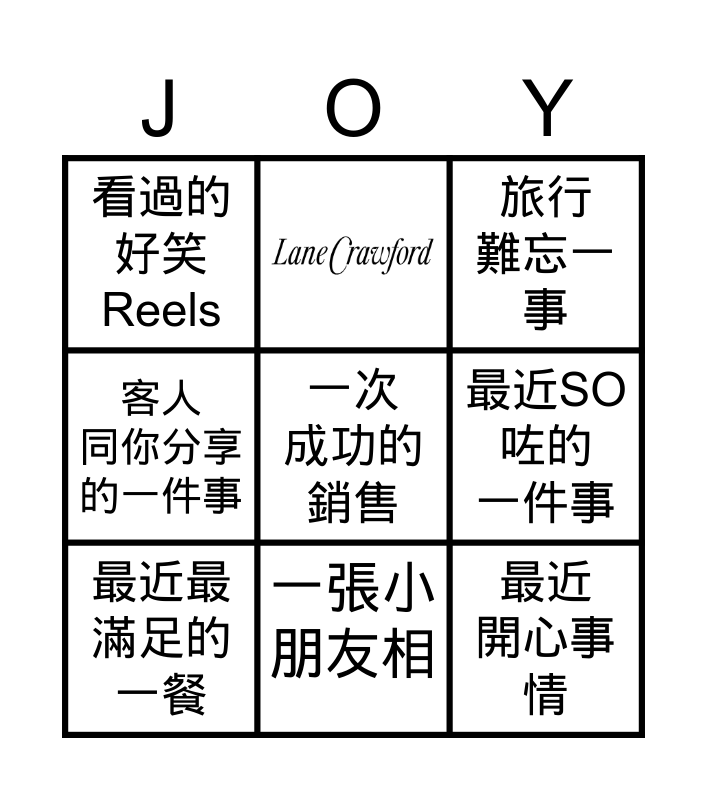 This bingo card has 1 images and 8 words: 最近最滿足的一餐, 一次 成功的銷售, 旅行 難忘一事, 看過的好笑Reels, 最近SO咗的 一件事, 客人 同你分享的一件事, 一張小朋友相 and 最近 開心事情.
