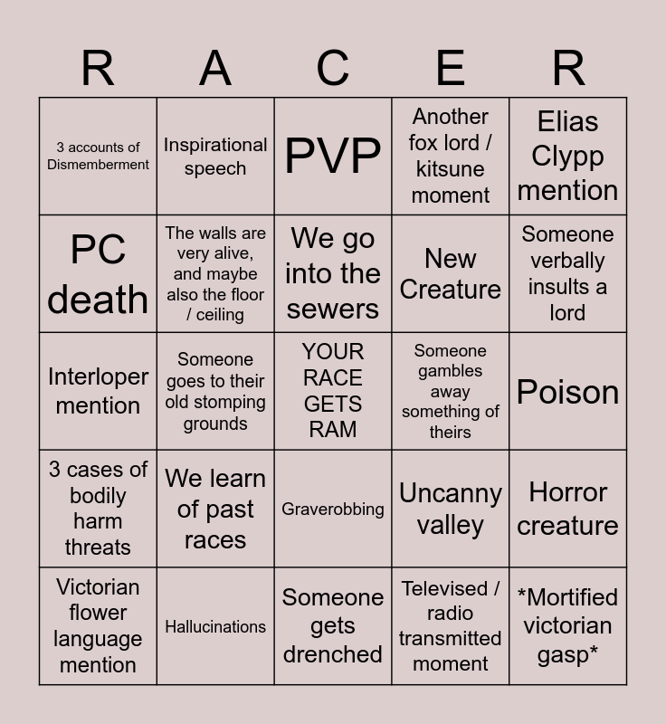 This bingo card has a free space and 24 words: We learn of past races, Hallucinations, We go into the sewers, Victorian flower language mention, Elias Clypp mention, 3 accounts of Dismemberment, PC death, Inspirational speech, Someone gambles away something of theirs, Graverobbing, New Creature, Interloper mention, Uncanny valley, Horror creature, The walls are very alive, and maybe also the floor / ceiling, Televised / radio transmitted moment, Poison, PVP, Someone verbally insults a lord, Someone goes to their old stomping grounds, *Mortified victorian gasp*, 3 cases of bodily harm threats, Another fox lord / kitsune moment and Someone gets drenched.