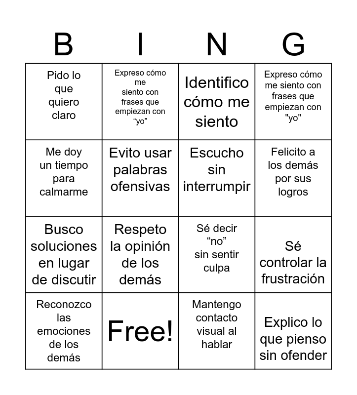 This bingo card has 24 words: Uso un tono de voz tranquilo, Expreso mis ideas sin gritar, Felicito a los demás por sus logros, Reconozco cuando estoy enojado(a), Me doy un tiempo para calmarme, Pido lo que quiero claro, Evito usar palabras ofensivas, Expreso cómo me siento con frases que empiezan con “yo”, Free!, Doy las gracias con frecuencia, Busco soluciones en lugar de discutir, Sé decir “no” sin sentir culpa, Acepto críticas constructivas, Pido ayuda cuando la necesito, Escucho sin interrumpir, Motivo a otros cuando están desanimados, Mantengo contacto visual al hablar, Identifico cómo me siento, Respeto la opinión de los demás, Sé controlar la frustración, Reconozco las emociones de los demás, Explico lo que pienso sin ofender, Expreso cómo me siento con frases que empiezan con "yo" and Trato a los demás como me gustaría ser tratado.