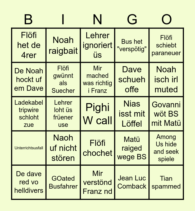 This bingo card has 25 words: Naoh uf nicht stören, Mir verstönd Franz nd, Mir mached was richtig i Franz, De dave red vo helldivers, Flöfi schiebt paraneuer, Flöfi het de 4rer, De Noah hockt uf em Dave, Noah raigbait, Nias isst mit Löffel, Flöfi chochet, Dave schueh offe, Ladekabel tripwire schloht zue, Matü raiged wege BS, Among Us hide and seek spiele, Flöfi gwünnt als Suecher, Tian spammed, Govanni wöt BS mit Matü, Lehrer ignoriert üs, Noah isch irl muted, Lehrer loht üs früener use, Pighi W call, GOated Busfahrer, Unterrichtsusfall, Bus het "verspötig" and Jean Luc Comback.