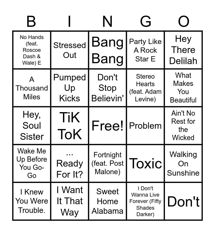 This bingo card has a free space and 90 words: Señorita, Sunflower - Spider-Man: Into the Spider-Verse, Fortnight (feat. Post Malone), Cruel Summer, Stacy's Mom, Jessie's Girl, Barbie Girl, Dancing Queen, I Want Candy, Uptown Funk (feat. Bruno Mars), Don't Worry Be Happy, Cake By The Ocean, E, Ain't No Rest for the Wicked, Love Yourself, Don't Stop Believin', Cruise, Thunder, Call Me Maybe, Party In The U.S.A., SexyBack (feat. Timbaland), Sweet Caroline, Sweet Home Alabama, 24K Magic, Hey, Soul Sister, I Want It That Way, Firework, Wannabe, Roar, Counting Stars, All Star, Walking On Sunshine, Last Friday Night (T.G.I.F.), Wake Me Up Before You Go-Go, No Hands (feat. Roscoe Dash & Wale) E, Party Like A Rock Star E, Bang Bang, California Gurls, TiK ToK, What Makes You Beautiful, I Knew You Were Trouble., A Thousand Miles, ... Baby One More Time, Wrecking Ball, I'll Be There for You - Theme From "Friends", Toxic, Titanium (feat. Sia), Just the Way You Are, You Belong With Me, Honey, I'm Good, Love Story, Stereo Hearts (feat. Adam Levine), My House, Heart Attack, Shape of You, Bye Bye Bye, Problem, Mamma Mia, I Don't Wanna Live Forever (Fifty Shades Darker), Scream & Shout E, ME! (feat. Brendon Urie of Panic! At The Disco), ... Ready For It?, Don't, Centuries, Ice Ice Baby, Stressed Out, Pumped Up Kicks, I Don't Wanna Live Forever (Fifty Shades Darker), Scream & Shout E, ME! (feat. Brendon Urie of Panic! At The Disco), ... Ready For It?, Don't, Centuries, Ice Ice Baby, Stressed Out, Pumped Up Kicks, It Wasn't Me, Billie Jean, Heathens, September, What Do You Mean?, Hey There Delilah, Big Yellow Taxi, Shut Up and Dance, Dynamite, Teenage Dream, Starships, When Did You Get Hot?, Maroon and Mary's Song (Oh My My My).